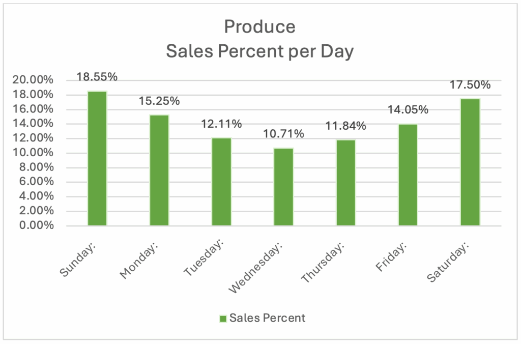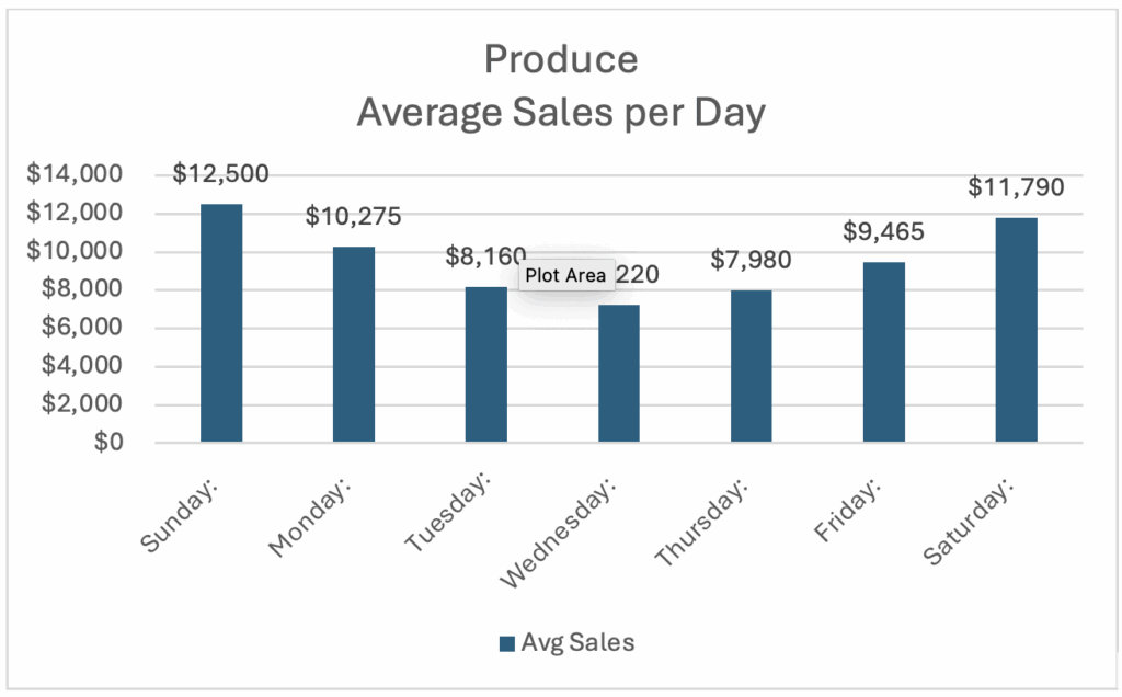 Knowing and using your average sales per day allows a team leader to meet customer service needs and profitability at the same time. In addition, understanding sales trends, and when they occur, allows a team to provide better product availability while minimizing shrink. Let’s review the following data. It is a 5-week average of daily sales for a produce department.